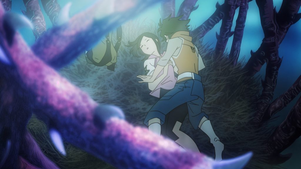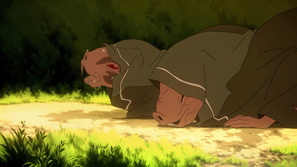 Il character design di Katsuyuki Satō è volutamente sobrio. I personaggi non devono “bucare lo schermo”, ma confondersi con il mondo che li circonda, diventare parte di un sistema più grande di loro. Pur nella sua semplicità, il design essenziale risulta molto gradevole ed espressivo, avvicinandosi a una sensibilità che privilegia il segno più che la forma piena, in una direzione non distante da quella di autori come Masaaki Yuasa, dove la sintesi grafica diventa strumento espressivo e non limite tecnico.